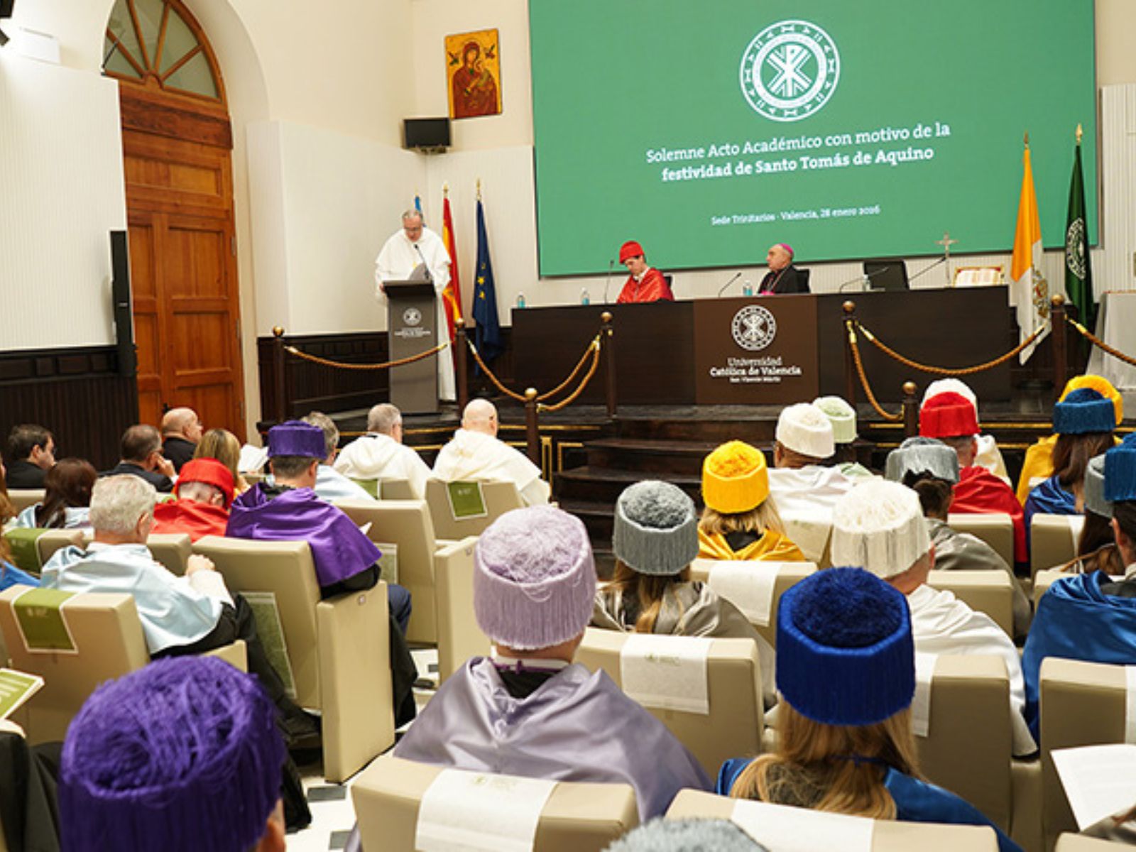 La Universidad Católica de Valencia (UCV) ha conmemorado la festividad de Santo Tomás de Aquino -patrón de las escuelas católicas, de las universidades y de la educación- en la histórica sede de la calle Trinitarios mediante la celebración de la eucaristía y el acto académico tradicional presididos por el arzobispo de Valencia, Mons. Enrique Benavent, gran canciller de la universidad. En su intervención en el acto, Benavent ha asegurado que “una universidad católica posee una exigencia, como cualquier otra, pero también un espíritu propio, una manera de hacer las cosas, un modo de afrontar la investigación que no elude las cuestiones éticas y antropológicas”.