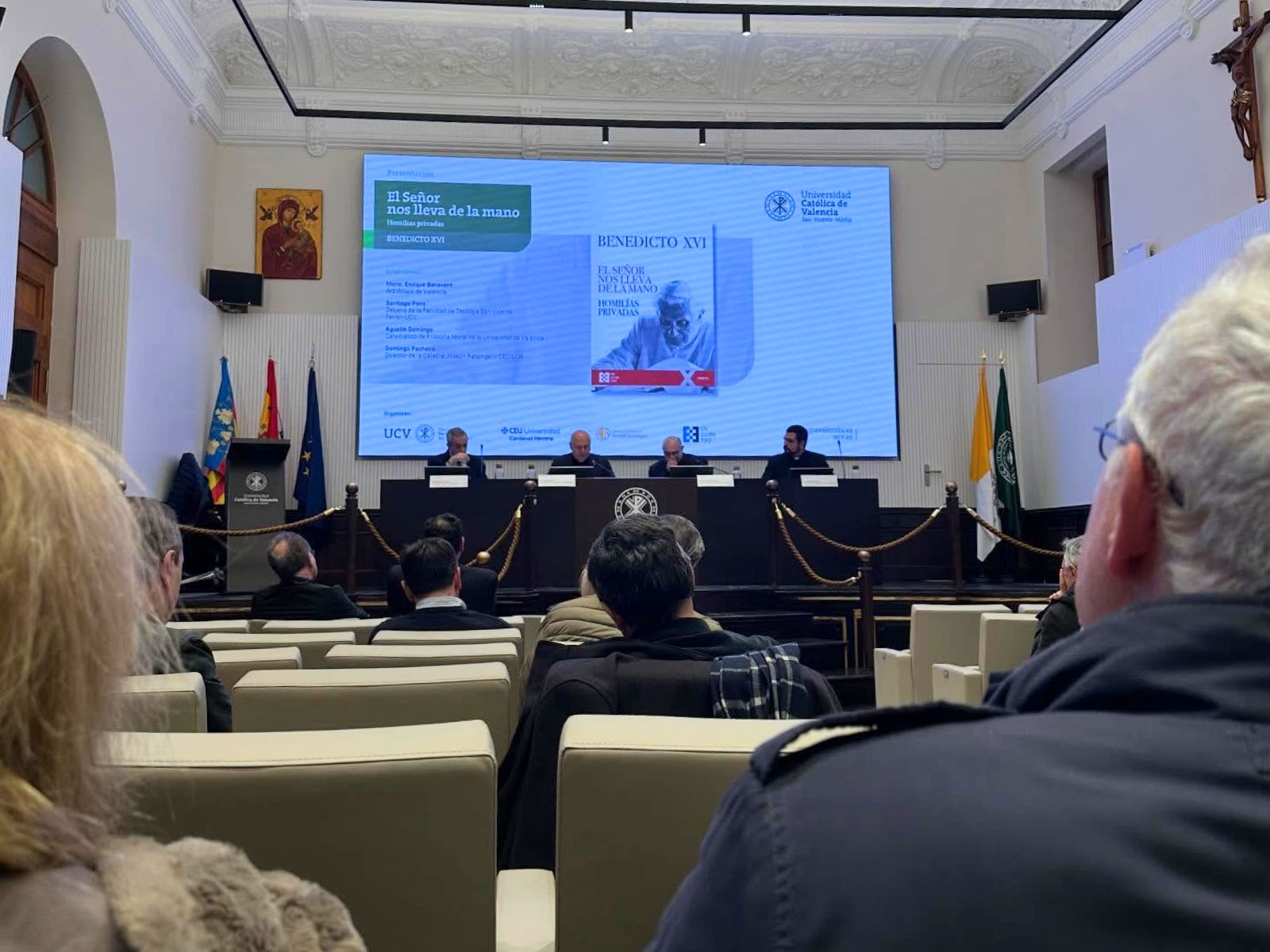 La Facultad de Teología San Vicente Ferrer de la Universidad Católica de Valencia (UCV) ha acogido la presentación en Valencia del libro El Señor nos lleva de la mano. Homilías privadas de Benedicto XVI (Ediciones Encuentro, 2025), editado y compilado por el jesuita Federico Lombardi, presidente de la Fundación Vaticana Joseph Ratzinger-Benedicto XVI, en un acto que se ha celebrado en la sede Trinitarios y que ha reunido a académicos y responsables eclesiales para dar a conocer esta obra centrada en textos inéditos del papa alemán.