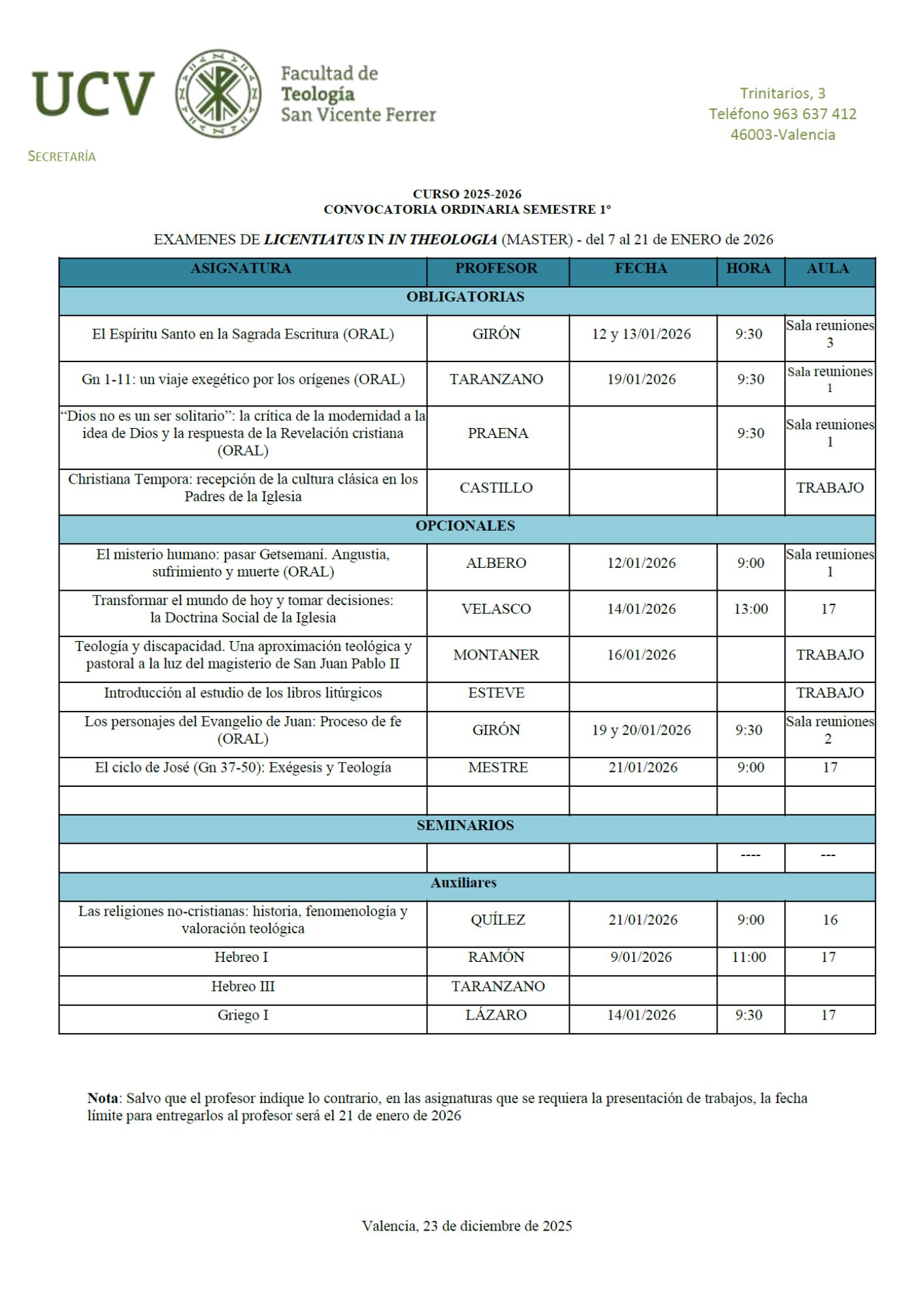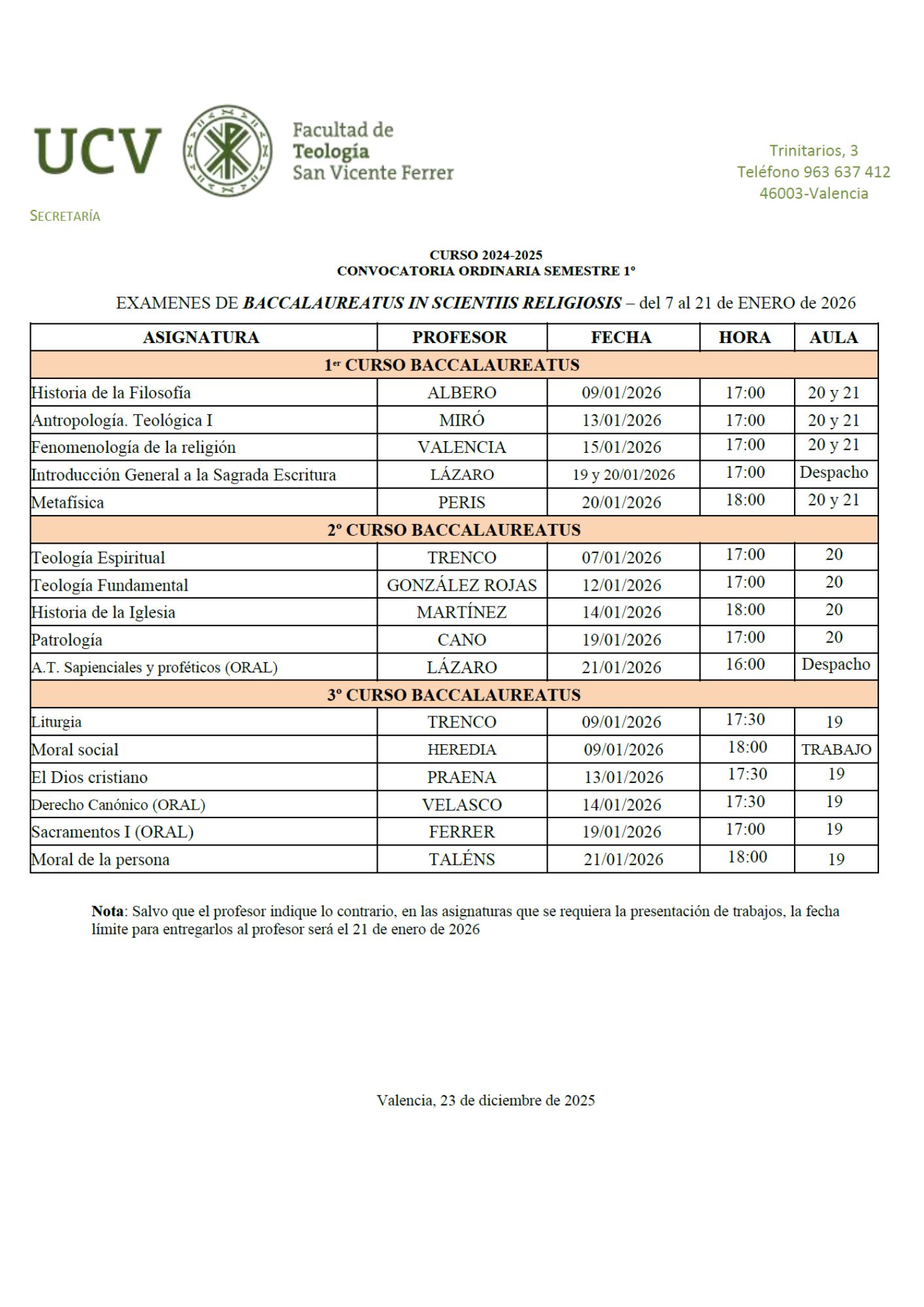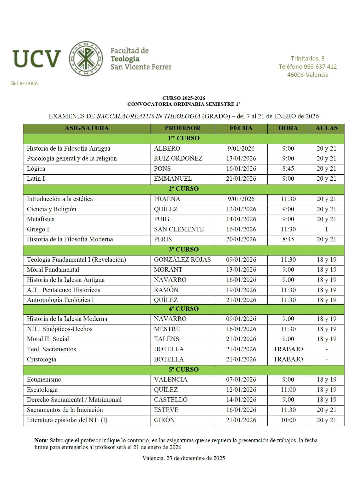 El periodo de exámenes de la Facultad de Teología San Vicente Ferrer de Valencia se desarrollará desde el 7 hasta el 21 de enero de 2026.