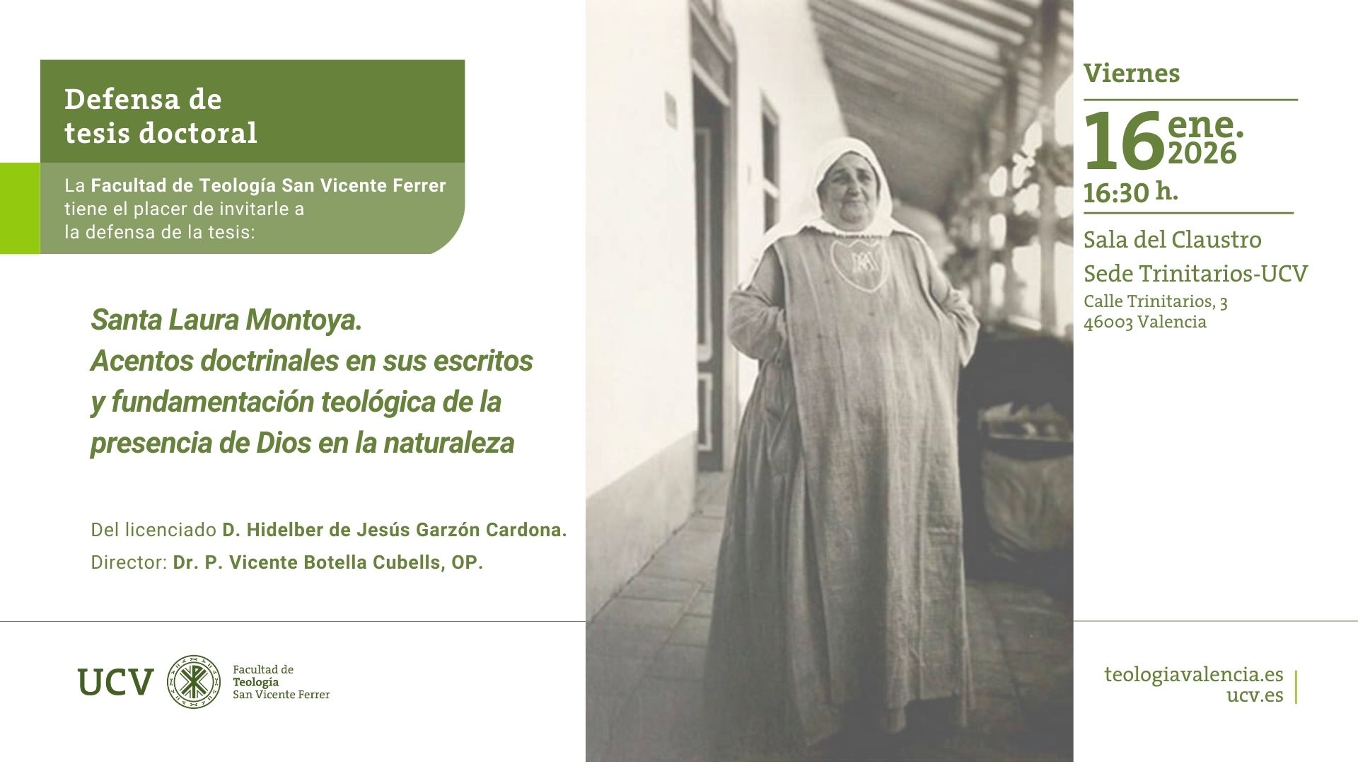 Santa Laura Montoya. Acentos doctrinales en sus escritos y fundamentación teológica de la presencia de Dios en la naturaleza es el título de la tesis doctoral que defenderá el licenciado Hidelber de Jesús Garzón Cardona el viernes 16 de enero de 2026 en la Facultad de Teología San Vicente Ferrer de Valencia.